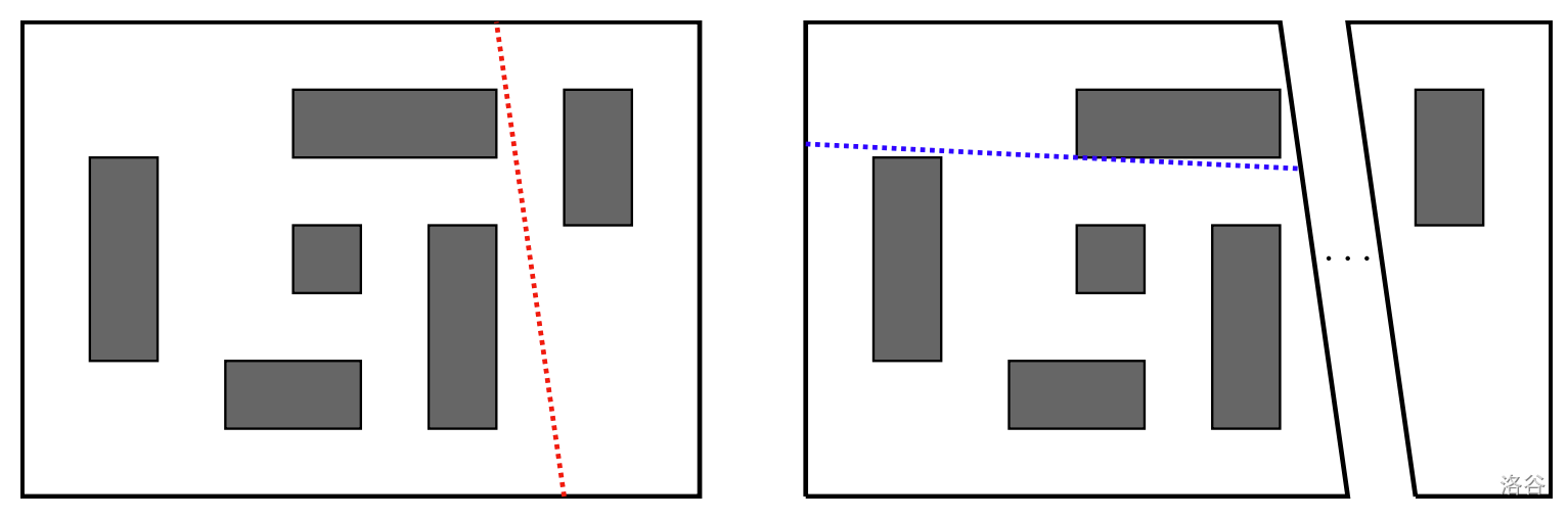 A cut must not "nick" any rectangle: it must not pass through any point strictly on the interior of any rectangle. (Cuts that pass along a rectangle edge or through a rectangle corner are allowed.)