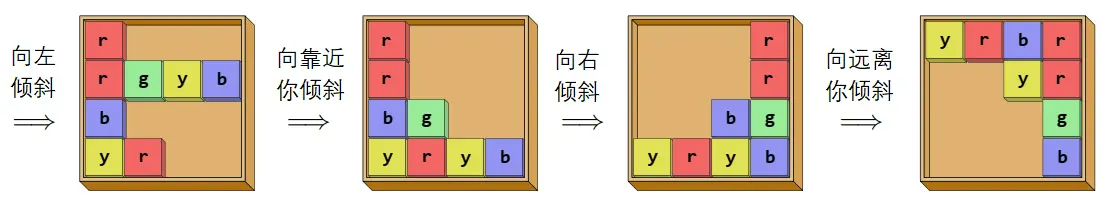 你还不确定这个玩具的确切目标是什么,但你已经开始研究重新排列方块的可能方法。可以通过将网格向左、向右、向着你或远离你的四个方向之一倾斜来实现让这些方块重排。倾斜会使所有方块向相应的方向滑动,直到被边界或其他方块挡住为止。给定一个起始和目标的方块排布,判断是否存在某种倾斜序列能将前者转化为后者。图 F.2 展示了样例 1 中所示玩具的倾斜过程。
