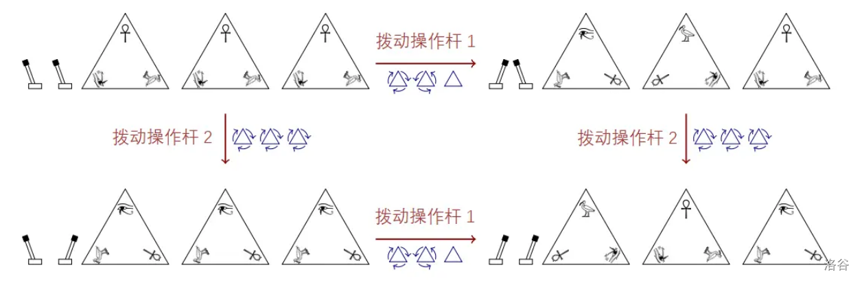 图 Z.1 展示了一堵有 3 个金字塔石板和 2 个操纵杆的墙。第一个操纵杆使第一个金字塔顺时针旋转,第二个金字塔逆时针旋转,第三个金字塔保持不变。第二个操纵杆使三个金字塔都顺时针旋转。这对应样例 1。