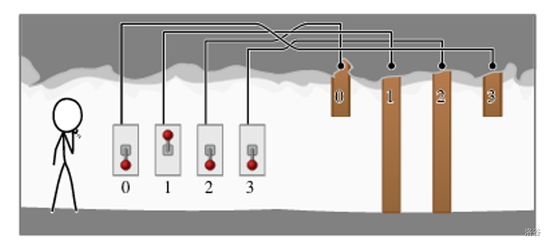 The switches are all located at the entrance to the cave. Each switch can either be in an up or down position. Only one of these positions is correct for each switch. If a switch is in the correct position then the door it is connected to will be open, and if the switch is in the incorrect position then the door it is connected to will be closed. The correct position may be different for different switches, and you do not know which positions are the correct ones.