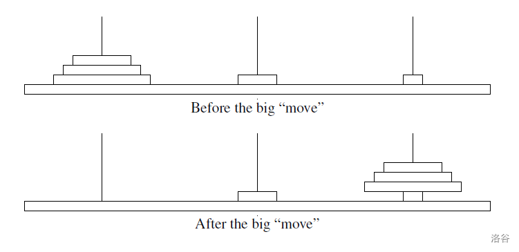 Lucas was showing his son how to solve the game step by step. He has already done the first optimal moves. Since it will still take a while to finish, he took a short break to grab some snacks. Unfortunately, when he came back, he found that his naughty little son has done a big "move": knowing that the goal is to transfer all disks from the first rod to the last rod, his son literally transferred "all disks from the first rod to the last rod" in one move (without changing their respective order), see figure K.1.