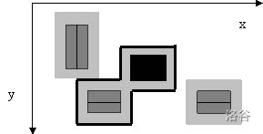 Figure 1: The main mansion (black) and three other buildings with surrounding forbidden rectangles. The thick black line shows a shortest allowed fence enclosing the main mansion.