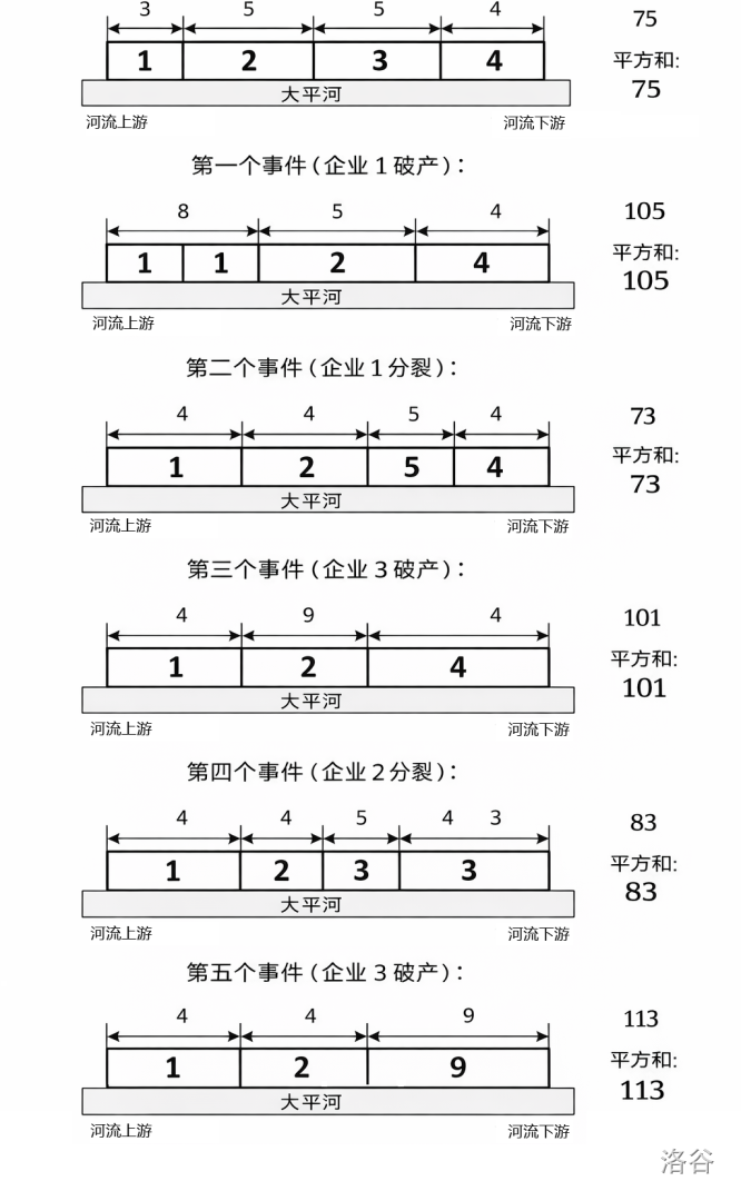 在每一个事件发生后,企业之间的河段分配如下图所示: