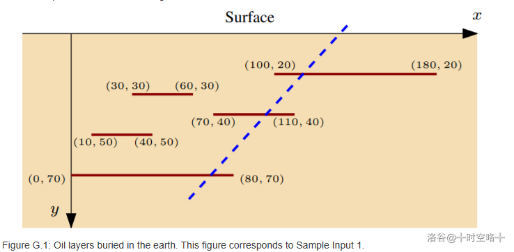 为了简化其分析,ICPC 只考虑二维情况,其中油藏被建模为与地球表面平行的水平线段。ICPC 想知道如何放置一个单独的油井以提取最大量的石油。油井沿着一条直线从地面钻井,并可以从其下降的路径上相交的所有沉积物中提取石油,即使相交点位于沉积物的端点处。图 G.1 中显示了一个这样的井,击中三个沉积物。在这个简单的模型中,一个沉积物中含有的石油量等于该沉积物的宽度。你能帮助 ICPC 确定通过一个单井可以提取的最大石油量吗?