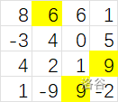 贝茜请你来帮忙,找到一行、一列或一条对角线上找一段连续的数字,它们的和最大.由于妖精方格的神奇特性,沿着一个方向走,走到了边际,再一步跨过去可以“绕”到方格的对边出现.一行两端的格子是相邻的,一列两端的格子也是相邻的,甚至相邻两行的分别两端的格子也是相邻的(斜对角方向).