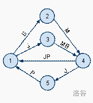 第 行,每行两个正整数 和一个字符串 ,描述一条从 到 ,并且能够购买配料 的单行道。